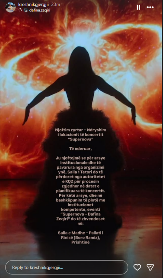 Për arsye institucionale dhe të pavarura nga organizatorët, koncerti I këngëtares Dafina Zeqiri i planifikuar të mbahet në Sallën “1 Tetori” tani do të mbahet në Sallen e Madhe të pallati i Rinisë.