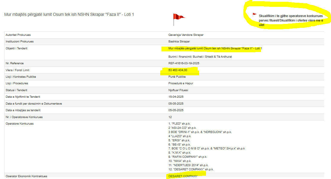 Më konkretisht, tenderi i Bashkisë Skrapar me objekt “Mur mbajtës përgjatë lumit Osum tek ish-NSHN Skrapar “Faza II” – Loti 1” është shpallur më 15 prill 2025 dhe është mbajtur më 5 maj 2025. Sipas dokumenteve të dorëzuara në APP, nga 12 operatorë konkurrues, 8 prej tyre janë skualifikuar menjëherë me kleçka të ndryshme. Dhe janë ofertat më ekonomike që janë përjashtuar nga gara.