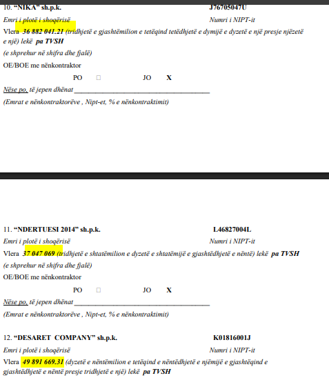 Në mes të të skualifikuarve është edhe “RAFIN COMPANY” sh.p.k. me vlerën 39 655 563 lekë pa TVSH. Po ashtu kompania “NIKA” sh.p.k. me ofertë 36 882 041 lekë pa TVSH. I skualifikuar është edhe “NDERTUESI 2014” sh.p.k. me ofertën 37 047 069 lekë pa TVSH.