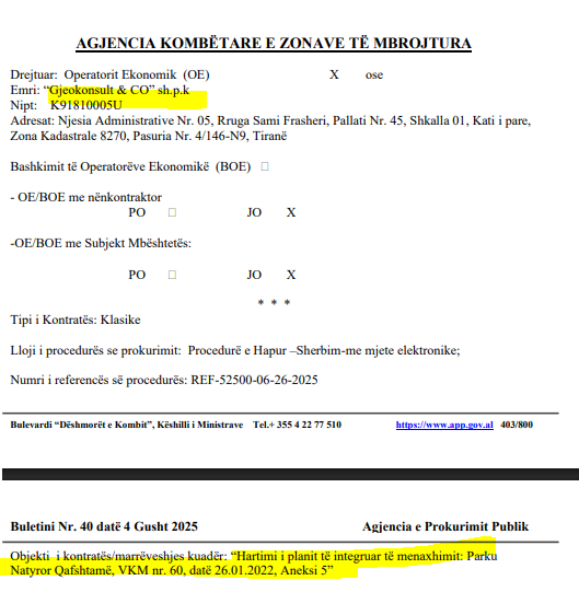 Në këtë tender janë paraqitur edhe  “Lurimi” shpk, “Gjeokonsult & CO” shpk, “Infratech” shpk, “Xhet” shpk “C.E.C Group” shpk, “Taulant” shpk. Megjithatë pjesëmarrja duket formale pasi kontratat duken të paracaktuara. Është i njëjti grup studiosh që bëjnë oferta të përafërta për të gjitha kontratat e kësaj agjencie. Tenderi tjetër ka në qendër të tij Parkun Natyror Kombëtar të Llogarasë. Këtë kontratë e ka fituar kompania “Tualant” sh.p.k me pronare Ditikia Qatipin.