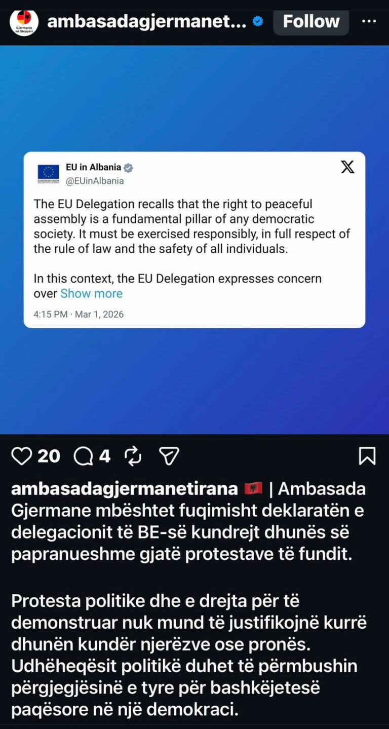 Ambasada Gjermane në Tiranë mbështet qëndrimin e delegacionit të BE-së publikuar gjatë ditës së sotme ndaj protestës së opozitës më 28 shkurt.