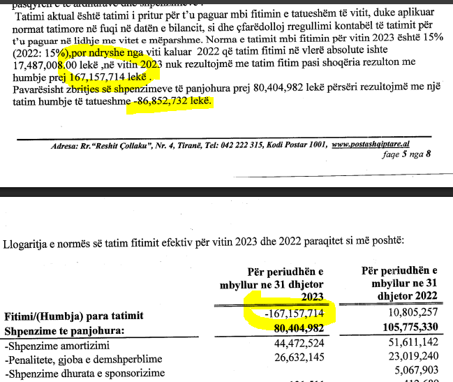 “Në vitin 2023 nuk rezultojmë me tatim fitim pasi shoqëria rezulton me humbje prej 167,157,714 lekë Pavarësisht zbritjes së shpenzimeve të panjohura prej 80,404,982 lekë përsëri rezultojmë me një tatim humbje të tatueshme -86,852,732 lekë”, citojmë dokumentin e hartuar nga Demiri.