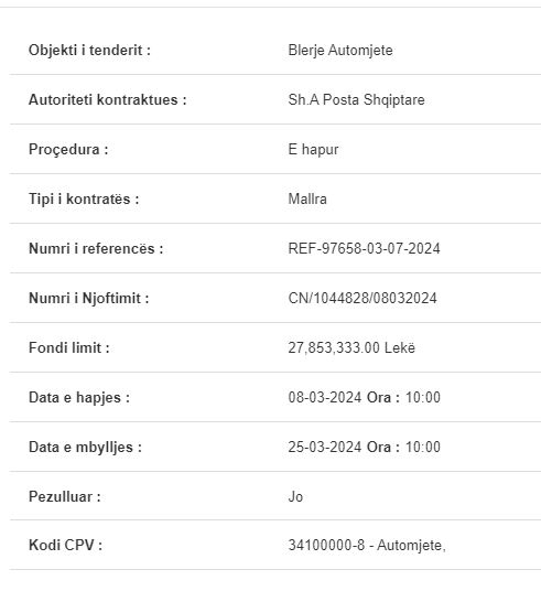 Siç shohim, ky projekt ka edhe një lot tjetër me objekt ‘Blerje automjete për dërgesa postare’. Sipas informacioneve do të bliheshin 6 makina të tjera për të shpërndarë postat dhe do të shpenzoheshin 211 milionë lekë.