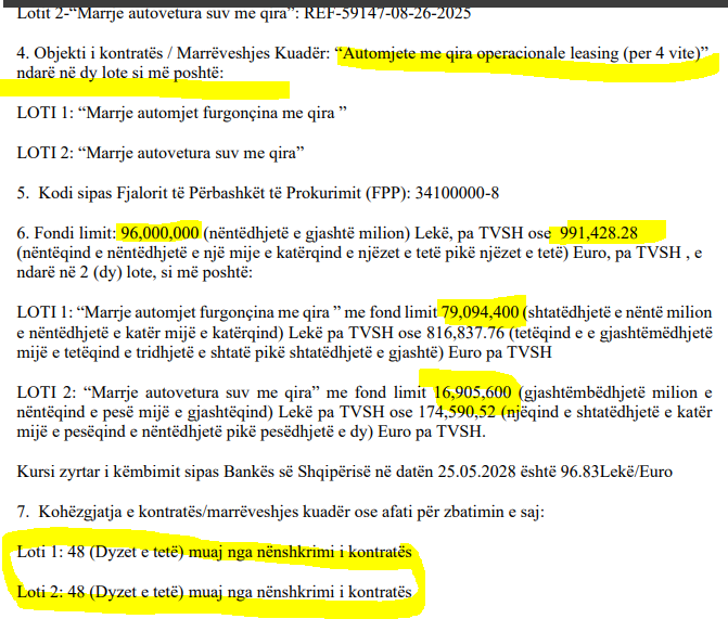 Kontrata totale me objekt “Automjete me qira operacionale leasing (per 4 vite)” e ka fondi limit: 96,000,000 Lekë, pa TVSH ose 991,428.28 Euro, pa TVSH , e ndarë në 2 (dy) lote, si më poshtë: LOTI 1: “Marrje automjet furgonçina me qira ” me fond limit 79,094,400 Lekë pa TVSH ose 816,837.76 Euro pa TVSH LOTI 2: “Marrje autovetura suv me qira” me fond limit 16,905,600 Lekë pa TVSH ose 174,590,52 Euro pa TVSH.