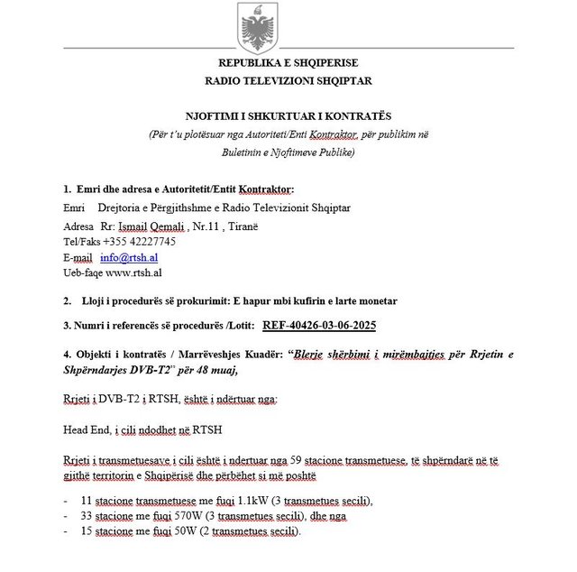Tenderi që zyrtarisht është hapur më 6 mars 2025 e ka fondin limit fond 907,816,536.8 lekë pa tvsh ose 9,156,914.8 euro pa tvsh. Përllogaritja me sa duket është bazuar në kontratën e mirëmbajtjes që ka pasur operatori i mëparshëm, të cilit sapo i ka përfunduar kontrata. Marrëveshja për shërbimin e mirëmbajtjes së rrjetit të shpërndarjes DVBT2, lidhur ndërmjet Drejtorisë së Përgjithshme të RTSH-së dhe shoqërisë ‘Rohde & Schwarz”, në një periudhë 4 vjeçare nga 1 marsi 2021, në vlerën 8.795.962 euro, me vlerë vjetore 2.1 milionë euro, mujore në vlerën 183.250 euro.