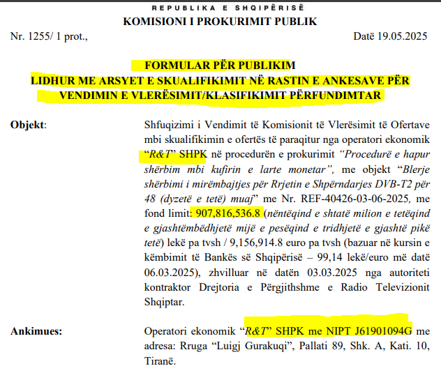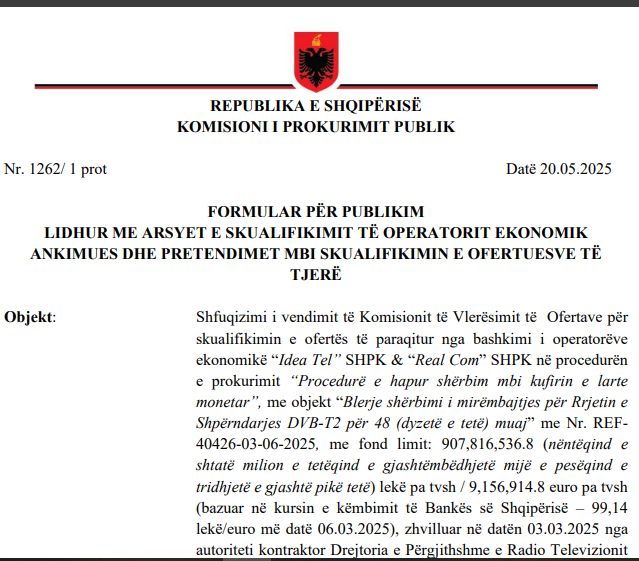 Por këto ditë mësojmë se tenderi është pezulluar nga denoncimet ndaj komisionit të vlerësimit të ofertave. Më 16 maj 2025, në sistemin elektronik të Komisionit të Prokurimeve Publike është dorëzuar ankesa e bashkimit të operatorëve ekonomikë “Idea Tel” SHPK & “Real Com” SHPK për procedurën e prokurimit me objekt “Blerje shërbimi i mirëmbajtjes për Rrjetin e Shpërndarjes DVB-T2 për 48 (dyzetë e tetë) muaj”.