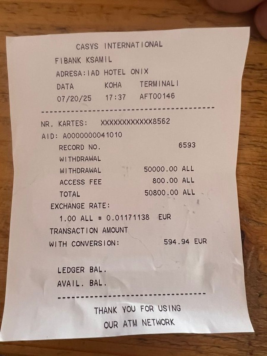 “Pashë rastin e atij gjermanit në Ksamil. Unë kam një hotel në Ksamil dhe çdo ditë përballem me raste të tilla. Dhe po na dëmtojnë shumë turizmin këto ATM, për shkak të komisioneve të frikshme që mbajnë. Kjo është një faturë e FI Bank, e një prej klientëve të mi, datë 20 korrik sivjet. Për një tërheqje prej 500 mijë lekësh të vjetra, i kanë mbajtur 94 € konvertim + 800 lekë komision. Ky klient ka ikur nga hoteli tashmë ka dy javë, por nga ankesa që bëri për bankomatet, i bëra një foto faturës që ta kisha, sepse i kemi raste të përditshme. Klienti ishte holandez. Duke parë postimin, mora shkas që t’ju shkruaja.” – shkruan denoncuesi për JOQ.