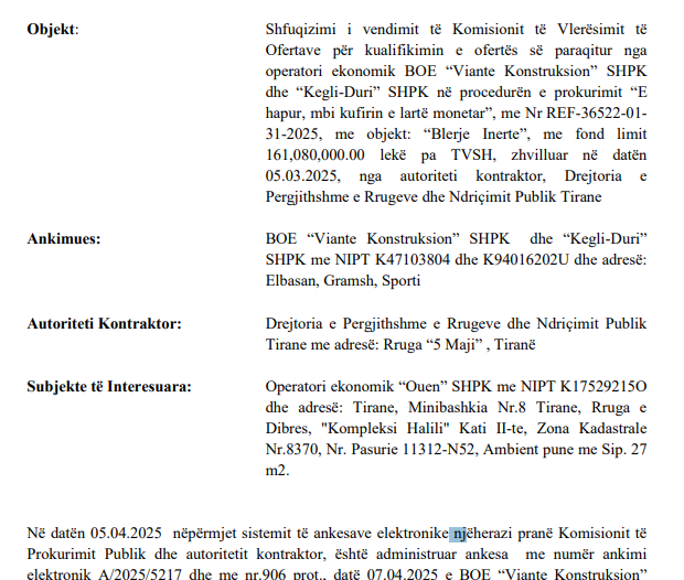 Ankesa lidhet me vendimmarrjen e Komisionit të Vlerësimit të Ofertave mbi kualifikimin e ofertës së paraqitur nga operatori ekonomik “Ouen” SHPK që është në pronësinë e Mehmet Hilajt.