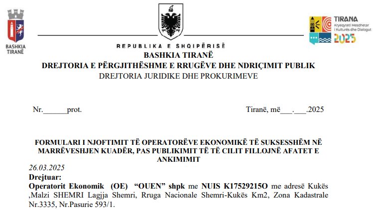 Denoncimi i bërë më 7 prill 2025, pretendon se kriteret e tenderit nuk përmbushen nga operatori ekonomik “Ouen” SHPK. “Dyshojmë se ky operator ekonomik nuk ka dhënë informacion konkret për plotësimin e disa prej rubrikave që lidhen me plotësimin e deklaratave të formularit të kërkesave të përgjithshme. Kemi dyshimet tona se ky operator nuk ka dorëzuar të gjithë dokumentacion fizik pranë autoritetit kontraktor ne përmbushje të dispozitave ligjore.