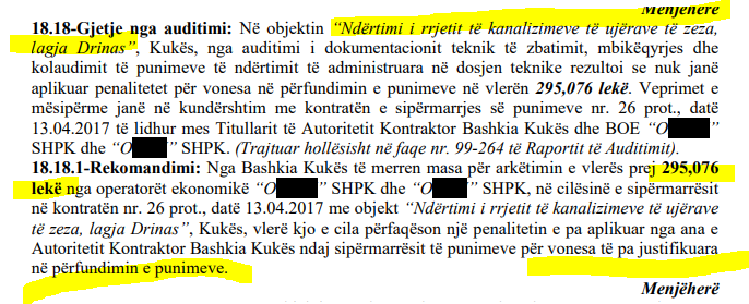 kolaudimit të punimeve të ndërtimit të administruara në dosjen teknike rezultoi se nuk janë aplikuar penalitetet për vonesa në përfundimin e punimeve në vlerën 295,076 lekë. “Veprimet e mësipërme janë në kundërshtim me kontratën e sipërmarrjes së punimeve nr. 26 prot., datë 13.04.2017 të lidhur mes kryetarit të Bashkisë Kukës dhe BOE “ORUÇI” SHPK dhe “OUEN” SHPK”, konstaton KLSH në raportin e vitit 2018.