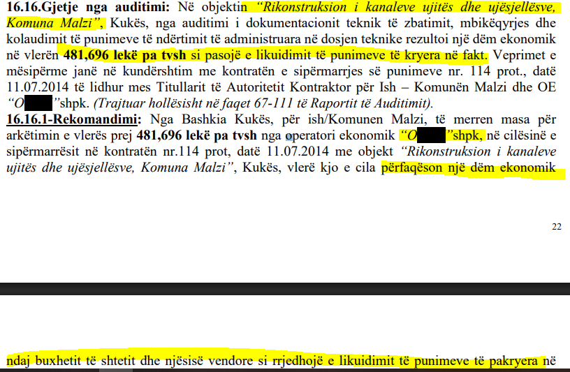 Ndërsa në objektin “Rikonstruksion i kanaleve ujitës dhe ujësjellësve, Komuna Malzi”, Kukës, nga auditimi i dokumentacionit teknik rezultoi një dëm ekonomik në vlerën 481,696 lekë pa tvsh si pasojë e likuidimit të punimeve të kryera në fakt. Veprimet e mësipërme janë në kundërshtim me kontratën e sipërmarrjes së punimeve nr. 114 prot., datë 11.07.2014 të lidhur mes Titullarit të Autoritetit Kontraktor për Ish – Komunën Malzi dhe operatorit ekonomik “OUEN”shpk. Me këtë rast rekomandohet që nga Bashkia Kukës, për ish/Komuna Malzi, të merren masa për arkëtimin e vlerës prej 481,696 lekë pa tvsh nga operatori ekonomik “OUEN”shpk, në cilësinë e sipërmarrësit, vlerë kjo e cila përfaqëson një dëm ekonomik ndaj buxhetit të shtetit dhe njësisë vendore si rrjedhojë e likuidimit të punimeve të pakryera në fakt.