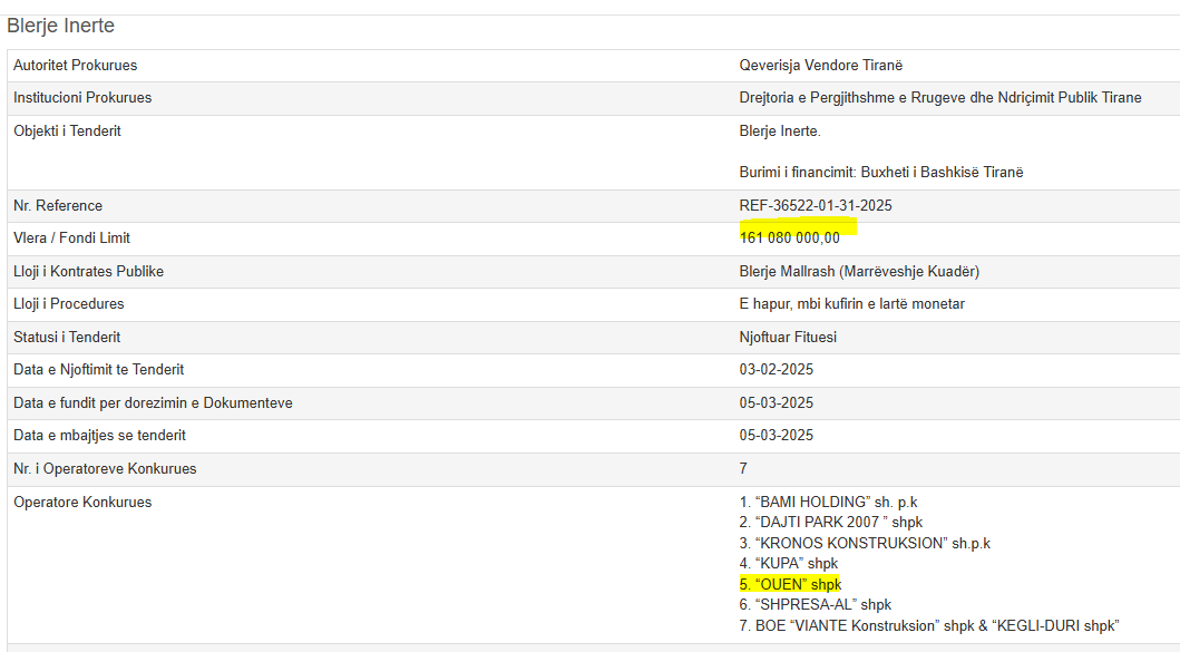 Bëhet fjalë për tenderin e Drejtorisë së Përgjithshme të Rrugëve dhe Ndriçimit Publik Tiranë me objekt “Blerje inerte” me fond limit 161 080 000,00 lekë. Tenderi është njoftuar në Agjencinë e Prokurimeve Publike më 3 shkurt 2025, ndërsa data e fundit për dorëzimin e dokumenteve ishte lënë për në 5 mars 2025. Megjithëse morën pjesë 7 kompani dhe bashkime firmash, komisioni i tenderit ka mbaruar punë shpejt pasi e kishte të qartë se kontratën duhej ta merrte Mehmet Hilaj, pronari i kompanisë “Ouen” shpk. Kompania me bazë në Kukës ka marrë fonde të mëdha këtë fillim viti duke u favorizuar nga komisionet e tenderave. Më 18 mars 2025, Hilaj do të merrte në Korçë tenderin e ndërtimit të Muzeut Dritëro Agolli me fondin limit 22 678 176,00 lekë. Kompania e fitoi tenderin me “Flamur të kuq”, që është shenja e riskut të korrupsionit, sipas Open Data Albania.