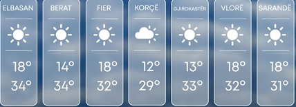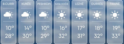 Ditën e sotme (11 korrik) vendi ynë do të jetë në ndikimin e kushteve atmosferike të qëndrueshme. Moti parashikohet i kthjellët në të gjithë territorin pa përjashtuar alternimet e vranësirave mesatare dhe hera-herës deri të dendura kryesisht në relievet malore nga orët e mesditës deri ato të pasdites.