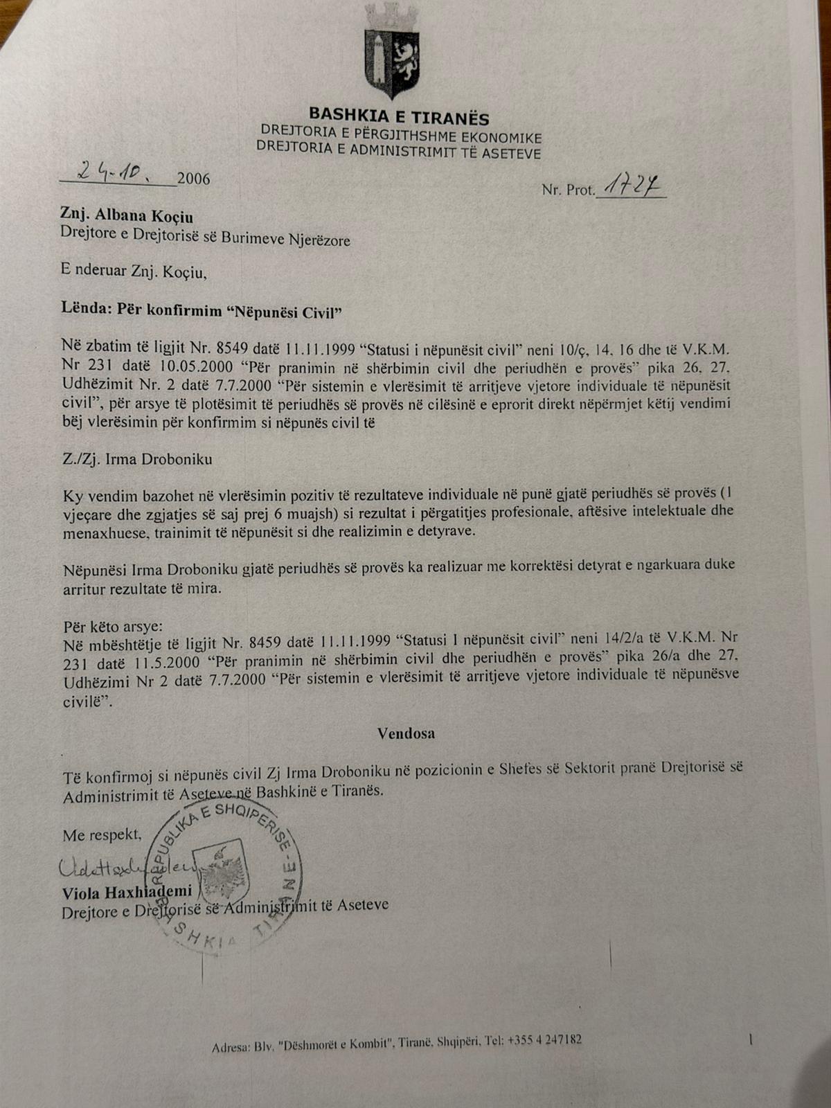 • në vitin 2006 konfirmohet dhe promovohet si nëpunëse civile në Bashkinë e Tiranës;