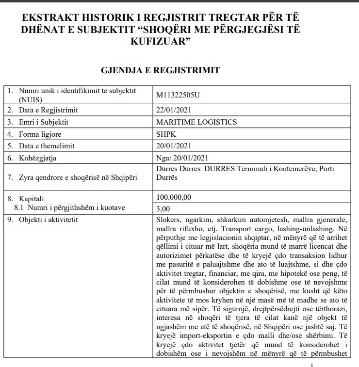 Nepotizimi i tyre nuk është thjesht për një vend pune. Vëllai i Ermal Nufit, Edmir Nufi rezulton ortak me me Hamz Islamajn te kompania e transportit të kontenierëve “MARITIME LOGISTICS”..