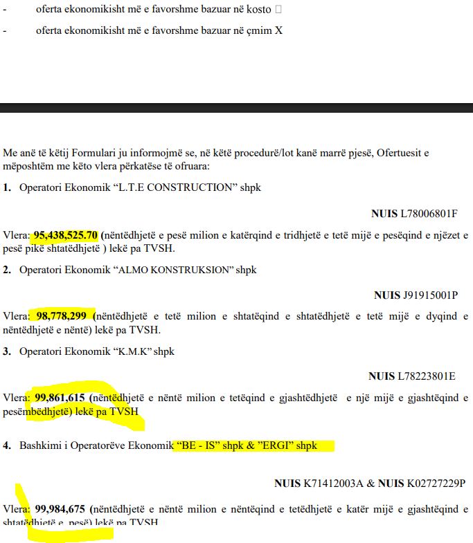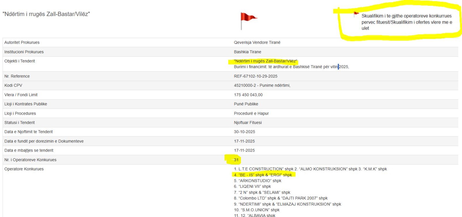 Në fazën e parë janë eliminuar 12 operatorë, mes të cilëve, të gjitha ofertat më të ulëta se sa vlera e prezantuar nga kompania BE-IS me pronar Hamz Islamajn. Ortak me fituesin në këtë tender është edhe kompania Ergi shpk e Nuri |Ballës.