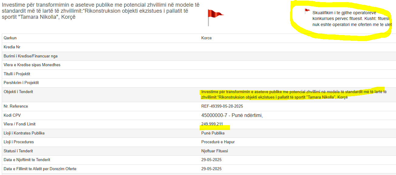 Tenderi është mbajtur më 16 qershor 2025 nga Fondi Shqiptar i Zhvillimit dhe ka si objekt: “Rikonstruksion objekti ekzistues i pallatit të sportit “Tamara Nikolla”, Korçë.  Ndërsa fondi limit i caktuar për këtë punë është 249,999,211 lekë pa tvsh.
