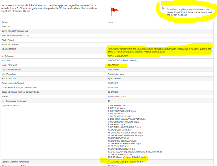 Edhe firma “ED KONSTRUKSION” sh.p.k ka bërë ofertën 86,103,201.67 lekë pa tvsh, me vlerë pak më ulët se sa ajo fituese, por e vlerësuar me më pak pikë nga komisioni.