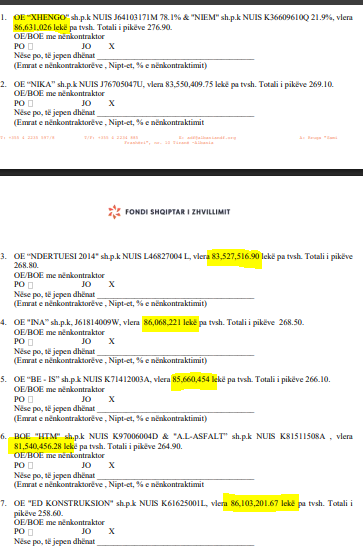 Theksojmë se kompania “NIKA” sh.p.k propozonte vlerën 83,550,409 lekë pa tvsh. Ndërsa “NDERTUESI 2014″ sh.p.k ka bërë ofertën 83,527,516.90 lekë pa tvsh.