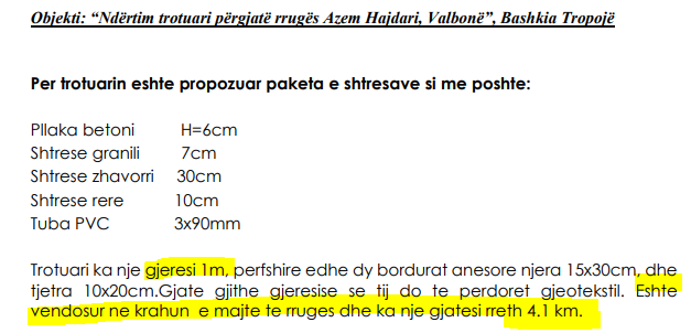 Bëhet fjalë për procedurën e prokurimit “Përmirësimi i transportit lokal dhe urban me ndërhyrje në rrugë dhe trotuare: Lot 5 -“Ndërtim trotuari përgjatë rrugës “Azem Hajdari”, Valbonë Bashkia Tropojë”.