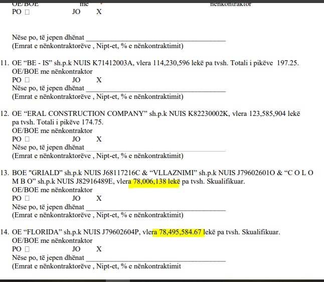 Ndërkohë në mes të ofertave të skualifikuara të bën përshtypje se kishte kompani të tilla si “GRIALD” sh.p.k , që bashkë me “VLLAZNIMI” sh.p.k dhe “C O L O M B O” sh.p.k propozonin të bënin këtë punë me 78,006,138 lekë.