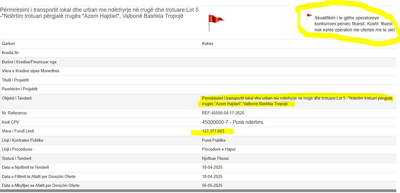“Skualifikim i të gjithë operatorëve konkurrues përveç fituesit. Kusht: fituesi nuk është operatori me ofertën më të ulët”, kështu e ka klasifikuar tenderin Open Data Albania. Madje i ka vendosur një “Flamur të kuq” që është shenja e riskut të korrupsionit.