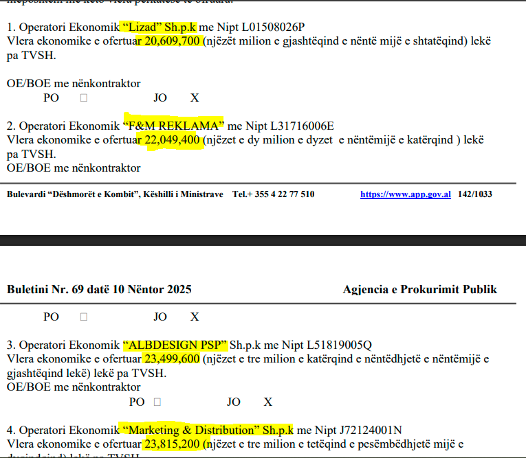 Kështu, operatori ekonomik “Lizad” Sh.p.k ka bërë ofertën 20,609,700 lekë pa TVSH. Firma “F&M REKLAMA” shpk ka prezantuar vlerën ekonomike të ofertuar 22,049,400 lekë pa TVSH.