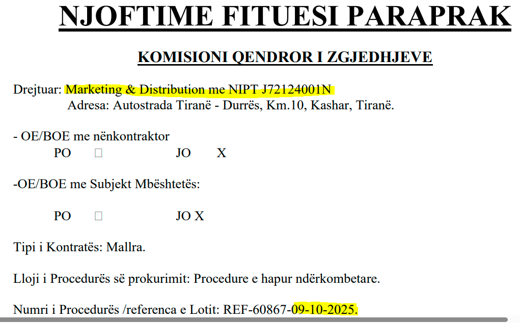 Duke iu referuar procedurës së lartpërmendur, KQZ njofton operatorin ekonomik “Marketing & Distribution” shpk se oferta e paraqitur me vlerë prej 23,815,200 lekë pa TVSH është identifikuar si e suksesshme.