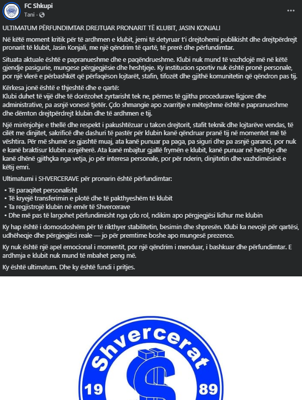 Situata aktuale është e papranueshme dhe e paqëndrueshme. Klubi nuk mund të vazhdojë më në këtë gjendje pasigurie, mungese përgjegjësie dhe heshtjeje. Ky institucion sportiv nuk është pronë personale, por një vlerë e përbashkët që përfaqëson lojtarët, stafin, tifozët dhe gjithë komunitetin që qëndron pas tij.