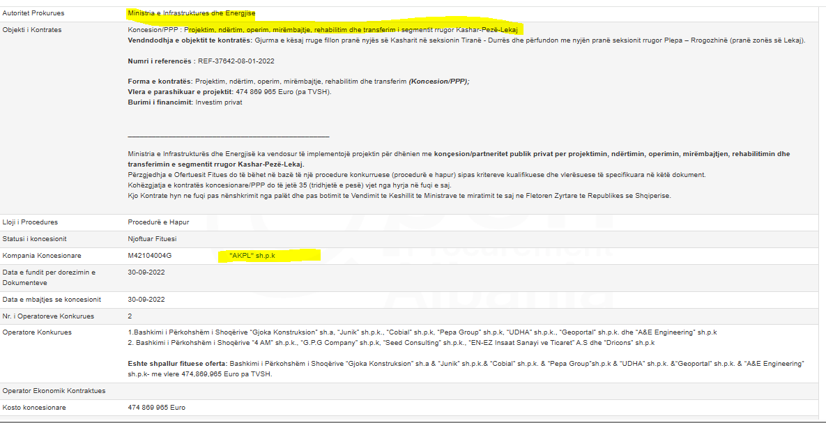 Ju kujtohet koncesioni për ndërtimin e rrugës “Kashar-Pezë-Lekaj’? Në 13 shkurt 2023, fitues i këtij koncesioni u shpall kompania “AKPL” shpk. Sigurisht që ky bashkim gërmash ka prapa subjekte të tjera. Kompania fituese e koncesionit me afat 35 vjet me vlerë 474 869 965 Euro, është e përbërë nga 7 firma. Në krye prin “Gjoka Konstruksion” shpk, më pas vijojnë “Junik” sh.p.k.& “Cobial” sh.p.k. & “Pepa Group”sh.p.k & “UDHA” sh.p.k. &“Geoportal” sh.p.k. & “A&E Engineering” sh.p.k.