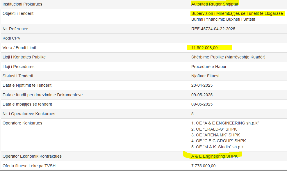 Bëhet fjalë për prokurimin e Autoriteti Rrugor Shqiptar me objekt “Supervizion i Mirëmbajtjes së Tunelit të Llogarasë”. Fondi Limit për këtë punë është 11 602 008,00 lekë pa TVSH. Megjithatë, nisur nga shkalla e lartë të korrupsionit të konstatuar në raport me paratë e hedhura në Tunelin e Llogarasë, rëndësia nuk qëndron tek vlera monetare e këtij tenderi.