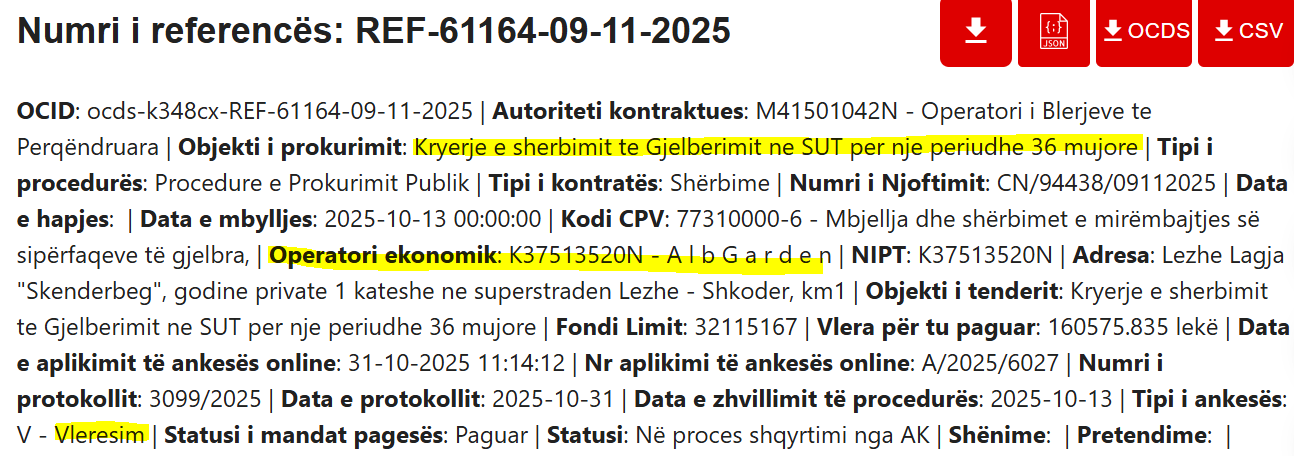Tenderi është denocuar më 31 tetor 2025 nga kmpania “A l b G a r d e n” shpk me pronar Pejtër Trashajn, i cili është i njohur për biznesin e mbjelljes së fidanëve. KPP e ka regjistruar ankesën online dhe e ka tashmë në procedurë shqyrtimi, që do të thotë se tenderi është i pezulluar për momentin, sa të maturohet pazari.