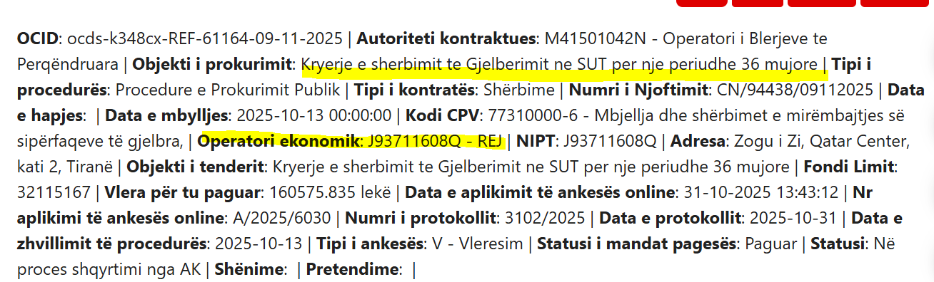 Në të njëjtën ditë është ankuar për këtë tender edhe kompania “Rej” shpk, me pronar Luan Kaprin. Edhe kjo firmë kundërshton vlerësimin e komisionit të tenderit që është mbajtur më 13 tetor 2025.