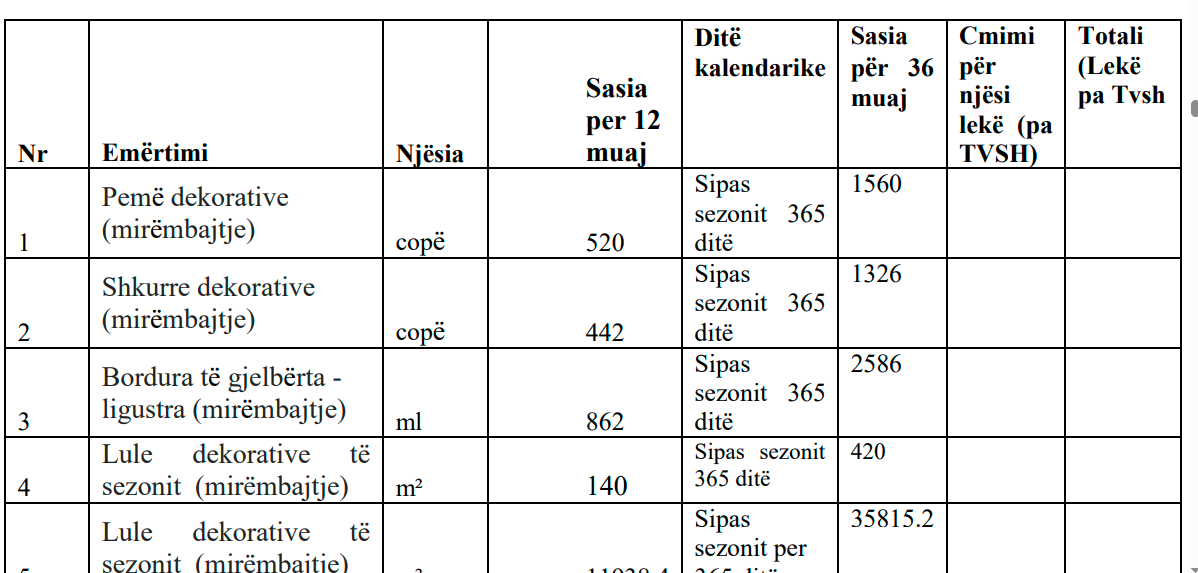 Bëhet fjalë për tenderin me objekt: “Kryerje e shërbimit të Gjelbërimit në SUT për një periudhë 36 mujore” me fond limit 32 115 167 lekë pa TVSH.