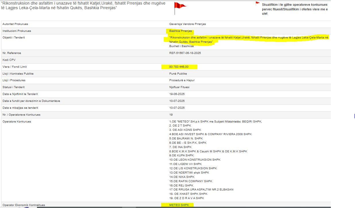 Temderi është mbajtur më 10 korrik 2025 dhe brenda asaj dite janë marrë vendimet e komisionit duke eliminuar ofertat konkurruese më të ulëta se ajo e kompanisë së Eral Myftarajt. Nga 19 operatorë ekonomikë pjesëmarrës, kryetari Belba ka skualifikuar menjëherë 10 prej tyre.