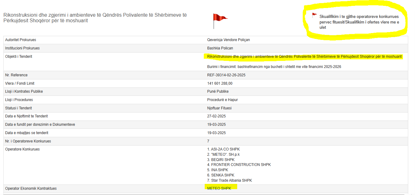 “Skualifikim i të gjithë operatorëve konkurrues pervec fituesit/ Skualifikim i ofertës me vlerë më të ulët”, kështu përshkruhet tenderi i fundit i Nuri Belbës nga Open Data Albania. Procedura është shënuar me “flamur të kuq” që është sheja e riskut të korrupsionit.