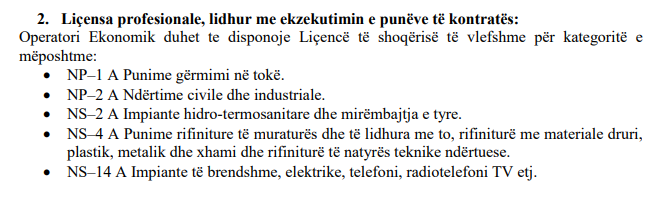 Ndërsa në dokumentet e tenderit kërkohen shumë licenca që duhet t’i ketë kompania. Në shkresën më poshtë renditen 5 licenca të ndryshme.