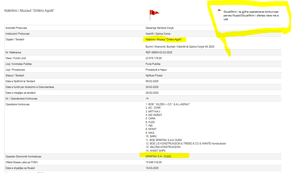 Deri datën e fundit të dorëzimit të dokumenteve, më 28 shkurt 2025 u paraqitën 14 pjesëmarrës. U propozuan oferta të larmishme, por fitues është shpallur bashkimi i operatorëve “SPARTAK S.A” – “OUEN” me vlerën 15 846 318,00 lekë. Nëse do të vlerësohej oferta ekonomike, në konkurrim kishte edhe vlera më të ulëta. Për shembull kompania “Nika” shpk bënte një propozim më ekonomik.