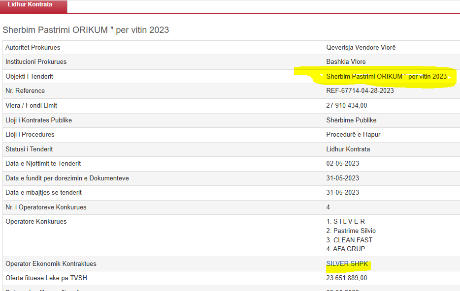 Firma “Silver” shpk është në pronësinë Linard Balanit. Kujtojmë se ky biznesmen ka firmosur kontratën më 19 qershor 2023 me Ermal Dredhën për pastrimin e Orikumit për afatin 1 vit. Në arkën e Balanit u derdhën 28 382 266 lekë të taksapaguesve të Orikumit. Situata ishte skandaloze.