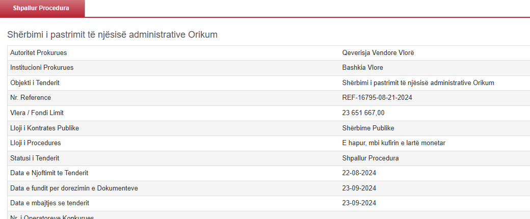 Ky është vendimi i KPP i datës 27 qershor 2025: Të lejojë autoritetin kontraktor (Ermalin) për vijimin me hapat e mëtejshëm të procedurës së prokurimit “E hapur, mbi kufirin e lartë monetar”, me Nr. REF-16795-08-21-2024, me objekt “Shërbimi i pastrimit të njësisë administrative Orikum”. Një turp i vërtetë! Tani që qyteti është në sezon turistik, Dredha vazhdon bën tender për pastrimin.
