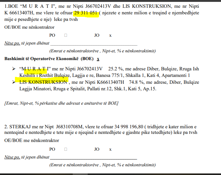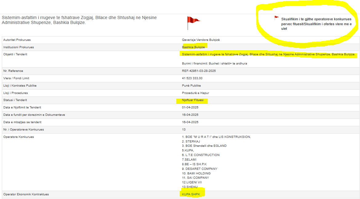 Tenderin e fitoi “Kupa” shpk edhe pse kishte oferta të tjera më të ulëta. Kjo firmë paraqiti ofertën 29 312 966,00 lekë pa TVSH dhe u shpall fituese më 27 maj 2025.