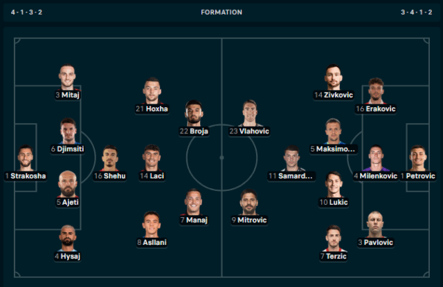Tashmë janë publikuar edhe formacionet zyrtare të supersfidës. Shqipëria rreshtohet me modulin 4-1-3-2. Sulmin e Shqipërisë do ta udhëheqë Armando Broja dhe Rey Manaj një dyshe që nuk jemi mësuar ta shohim në ndeshjet e kaluara.