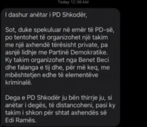 “Dega e PD-së Shkodër u bën thirrje të gjithë anëtarëve dhe mbështetësve të saj të distancohen nga ky takim, pasi ai nuk ka asnjë lidhje me Partinë Demokratike dhe i shkon për shtat axhendës së Edi Ramës”, thuhet në reagimin zyrtar.