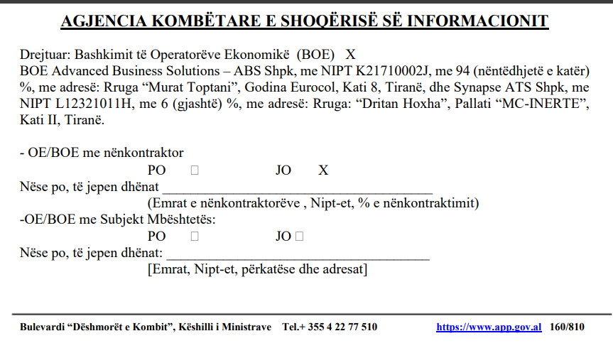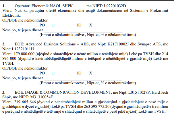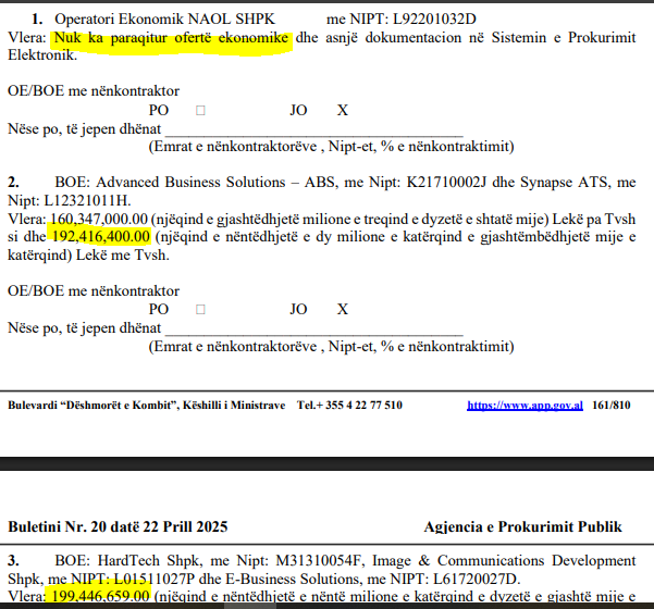 Ndërsa “Advanced Business Solutions – ABS” dhe Synapse ATS, ka bërë ofertën 192,416,400.00 Lekë me Tvsh.