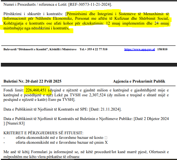 Fondi limit për këtë kontratë është 213,795,898 Lekë pa TVSH. Kohëzgjatja e kontratës ose afati kohor për ekzekutimin është 6 muaj implementim dhe 24 muaj mirëmbajtje nga nënshkrimi i kontratës. Meçe e kishte futur kontratën në xhep qysh në dhjetor 2024, por përmbajtja e saj u bë publike vetëm në prill 2025.