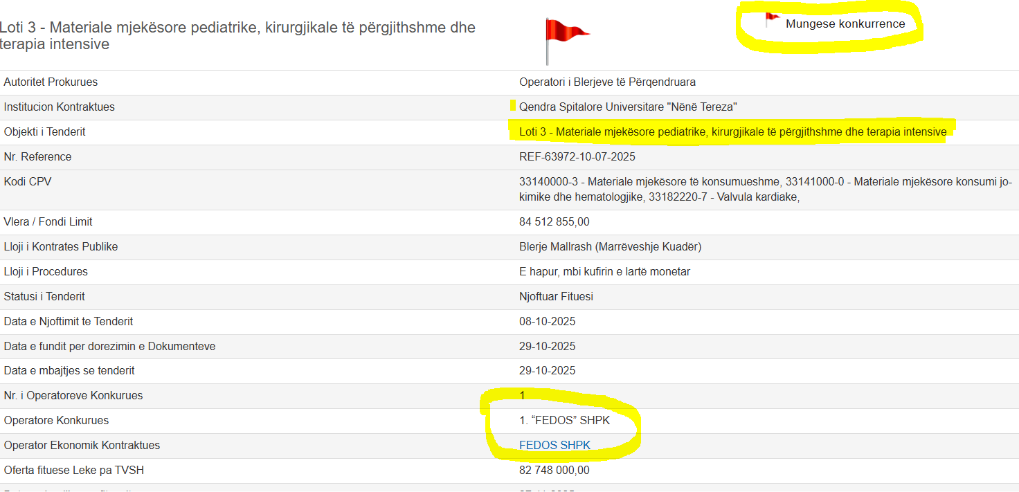 Open Data Albania e ka shënuar tenderin me “Flamur të kuq” që sinjalizon korrupsionin e mundshëm. Bëhet fjalë për kontratën e Qendrës Spitalore Universitare “Nënë Tereza” me objekt “Loti 3 – Materiale mjekësore pediatrike, kirurgjikale të përgjithshme dhe terapia intensive”.