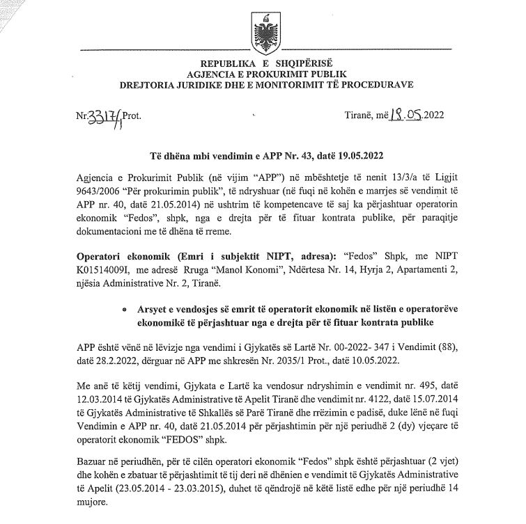 Gjatë procesit gjyqësor kompania pranoi se kishte dorëzuar dokumente të pasaktë për tender, por u justifikua se ky ishte një gabim i bërë nga një punonjës i papërgjegjshëm, ndaj të cilit kishte marrë masa menjëherë. Kështu, me urdhër nga lart, gjykata e shkallës së parë pranoi kërkesën e kompanisë “Fedos” dhe e rrëzoi vendimin për përjashtimin e saj nga tenderat. Por, APP si një institucion përgjegjës për verifikimin e tenderave vazhdonte të këmbëngulte se falsifikimi i dokumenteve ka qenë i qëllimshëm dhe jo një pakujdesi. Kështu, APP iu drejtua Gjykatës Administrative të Apelit. Por kjo e fundit, duke pasur një ndikim të fortë, në 2015 i dha sërish të drejtë kompanisë private.