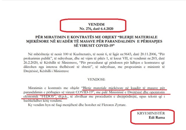 Gjatë pandemisë, në Fletoren Zyrtare është publikuar vendimi i qeverisë ku tregohet se i ka lidhur kontratën me objekt “blerje materiale mjekësorë për parandalimin e Covid-19”, ku ka shpallur fituese kompaninë “Fedos”. Ndërkohë që APP e varur drejtpërsëdrejti nga Edi Rama “luftonte” gjyqeve me kompaninë mashtruese, kryeministri ka bërë pazare sekrete me paratë e destinuara për blerje maskash e dorezash.