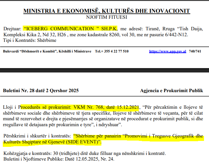 Ky ishte një tender i paracaktuar dhe fiktiv. Këtë e vërteton fakti se në garë ka marrë pjesë vetëm një garues, përkatësisht Iceberg Communication në pronësi të Rafaela Rica. Kjo kompani ka ofruar vlerën prej 7,387,000 lekësh të reja pa TVSH ose rreth 90 milionë lekë të vjetra me TVSH. Këtë kontratë e firmoste drejtoreshë Edlira Kraja.