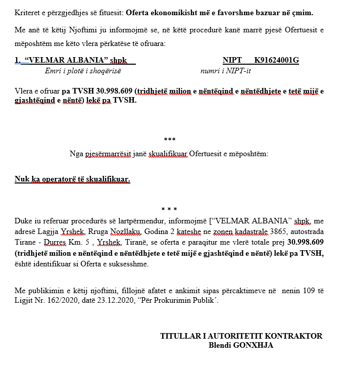 Procedura është fiktive sepse në të marrin pjesë dy operatorë: fituesi dhe një kompani tjetër që paraqet ofertë zero lekë. Kompania “VELMAR ALBANIA” SHPK me NIPT K91624001G ka bërë ofertën me vlerë 21.935.000 Lekë pa TVSH, që është thuajse e barabartë me fondin limit të caktuar për këtë shërbim.